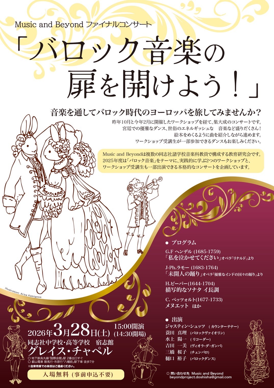 昨年10月のバロック楽器、2月のバロックダンス両体験ワークショプを踏まえての2025年度同志社諸学校音楽教員によるファイルコンサート。場所は京都市岩倉の同志社中学高等学校。響きの良いグレイスチャペルでの古楽器によるバロックコンサートです。バロック時代の宮廷や世俗の音楽、古楽器の音色を楽しんでいただければと思います。どなたでも自由にお越しください。