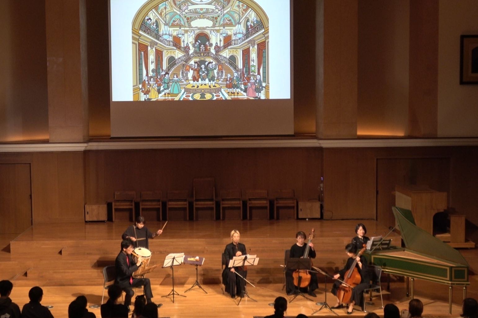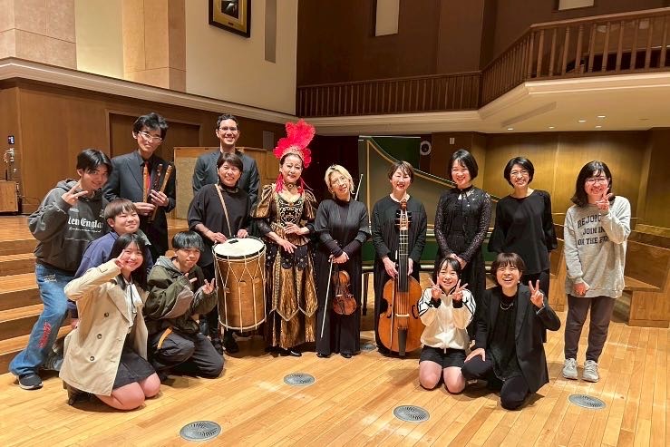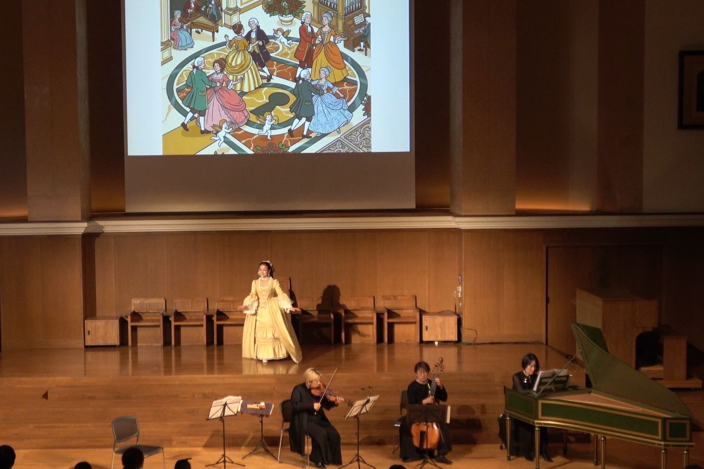 10月のバロック楽器体験と2月のバロックダンス体験両ワークショプに続き今回も本校生徒をはじめ大勢お越しいただきました。チャペルに響く古楽器の音色を皆様堪能され、最後は観客の皆様も参加してイギリス民謡「グリーンスリーブス」を古典舞踏で締めくくりました。