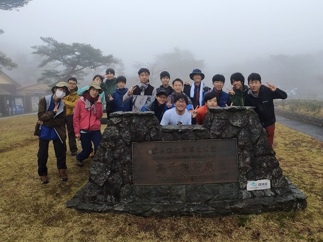 ワンダーフォーゲル部は3月25日〜28日、中高男女16名で鹿児島県霧島にて登山合宿を行いました。現在霧島は噴火により連山縦走が出来ないため麓にテント泊、26日に高千穂峰1574m、27日に韓国岳1700m、2日に分けてそれぞれの山に登りました。26日は強風のため高千穂河原で中断したものの翌27日の韓国岳は晴天。山頂からは360度のパノラマを見渡すことが出来ました。