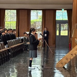 実りある中学校生活を送るために、三つのことを約束してください。一つ目は、あらゆる場面で「なぜ」を見つける「好奇心」を絶やさないこと。二つ目は、本校の図書館「繋真館」を活用した「読書」を通じて、先人との対話から多面的な視点を得ること。そして三つ目は、互いに高め合える「生涯の友(同志)」を得ることです。