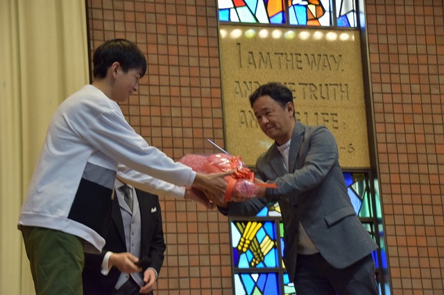 本校の教育活動に長きにわたりご尽力くださった保健体育科教諭竹田幸平先生が、ご退職の時を迎えられました。先生への感謝の気持ちを込めて、生徒を代表して自治会長より花束が贈呈されました。