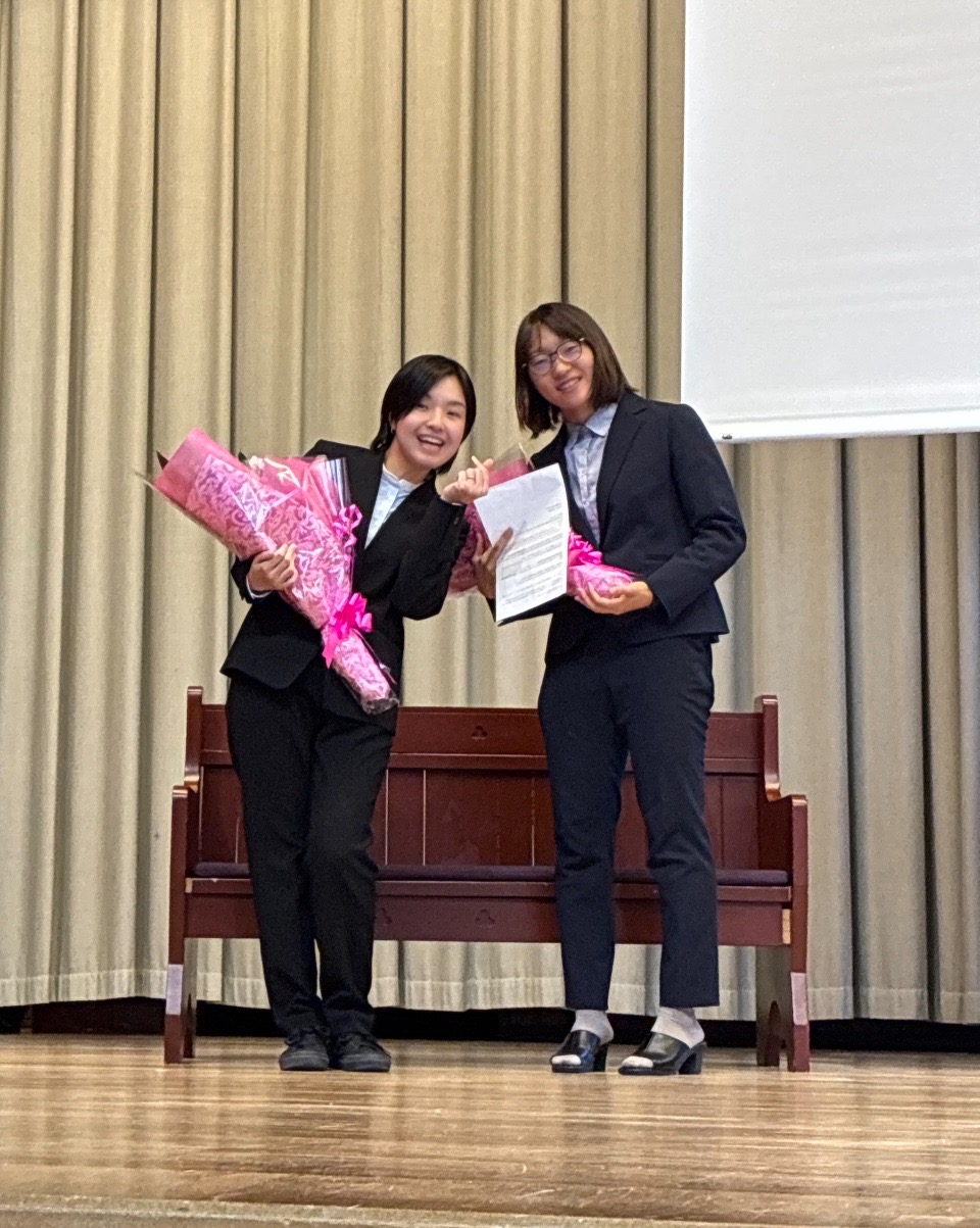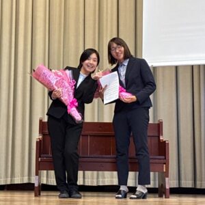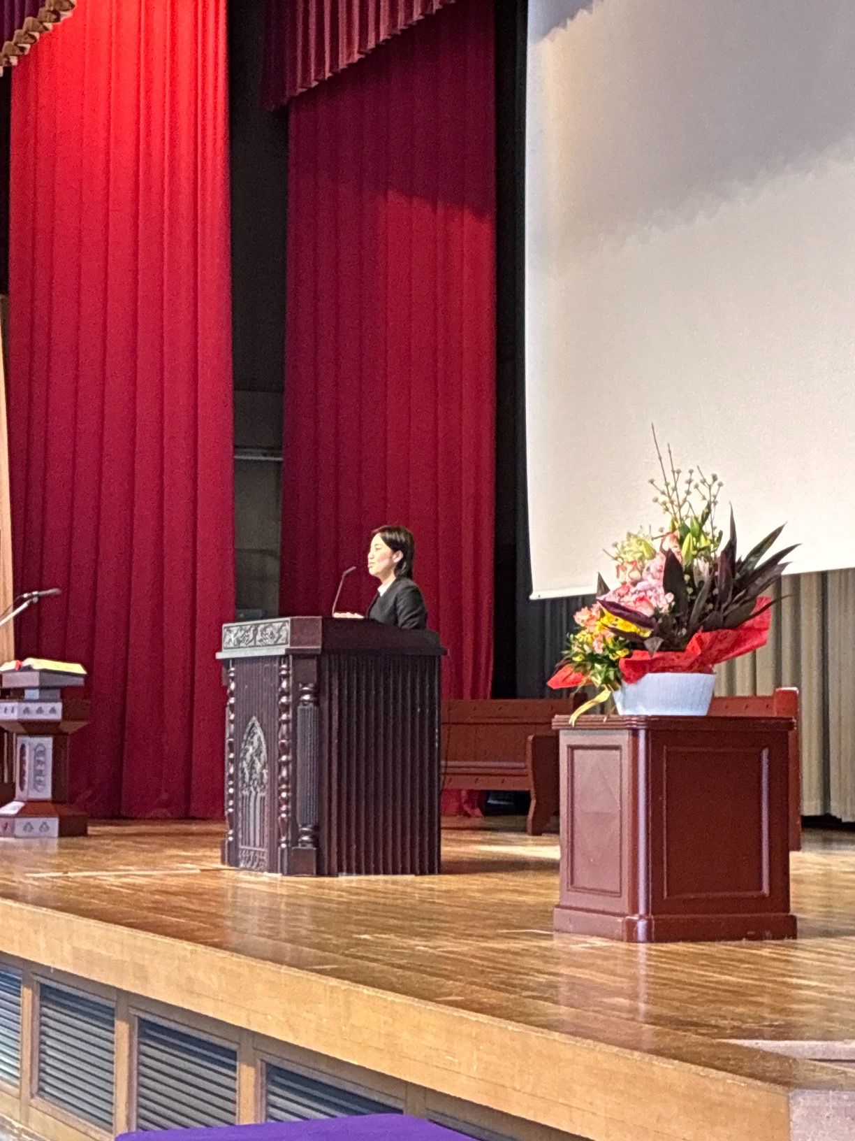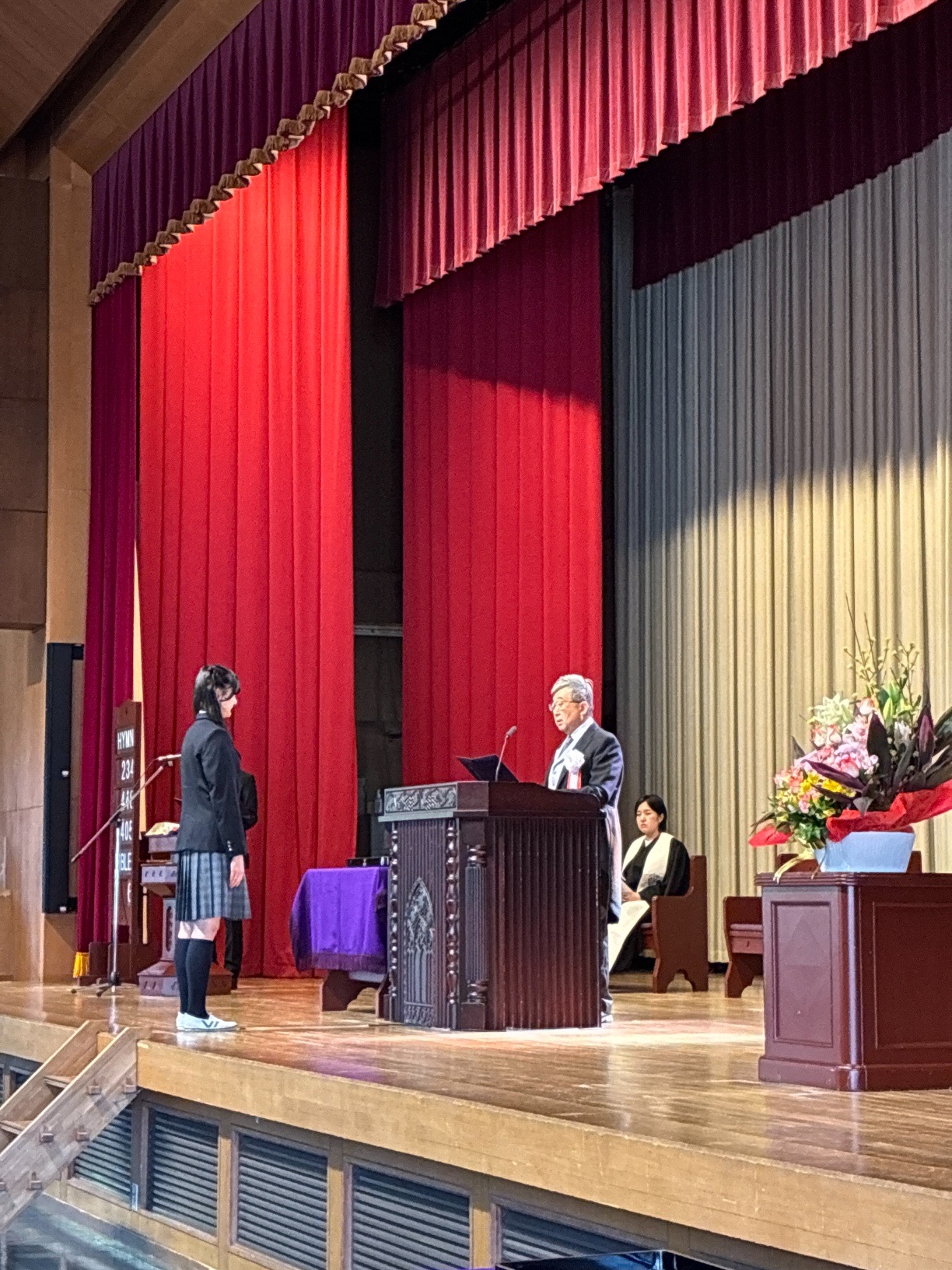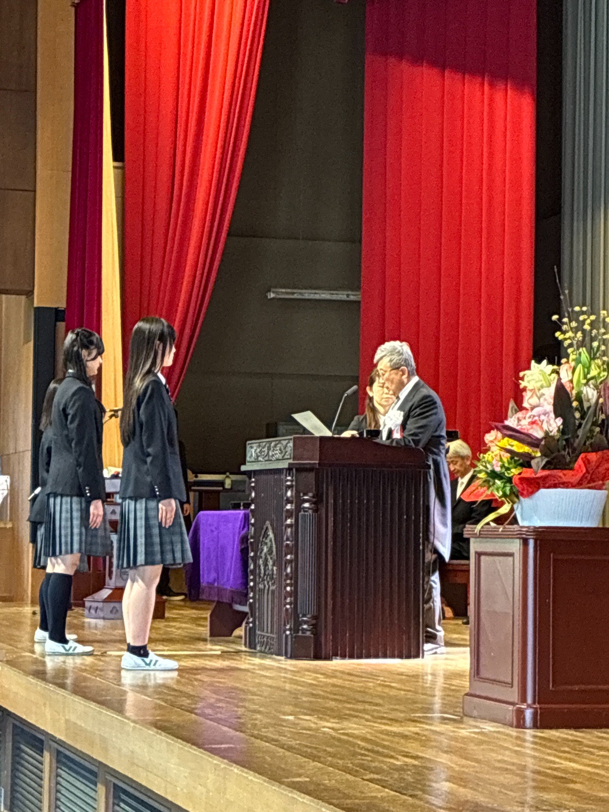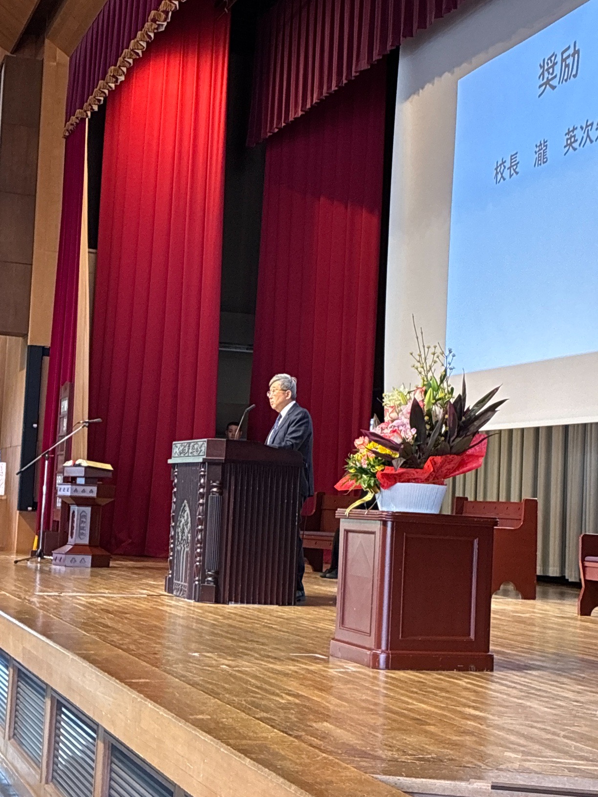 本校の教育活動に長きにわたりご尽力くださった社会科北川徹朗先生、聖書科教諭工藤尚子先生、国語科教諭櫛田夏織先生、事務室東田忠浩さんが、今年度ご退職されれました。感謝の気持ちを込めて花束が贈呈されました。