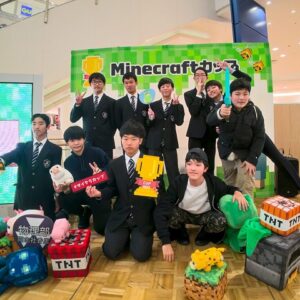 Minecraftカップは、未来の理想の街をゲーム「マインクラフト」で制作し、テーマ性や表現力、計画力などを競う全国規模の大会です。物理部は2024年度から参加しており、昨年度は「学校賞」と「かさい『ミライナカ』賞」を受賞しました。
