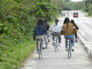 Dコースは石垣港から船に乗り竹富島へ渡りました。島に到着後はサイクリング開始です。竹富島は島の外周がおよそ9キロしかなく、自転車で島をくまなく散策する事ができました。生徒たちがよく向かったのは「星砂の浜」と「コンドイビーチ」。星砂の浜では星砂を探すことに夢中になり、コンドイビーチでは美しい海岸をバックに写真を撮ったり、砂浜に願いを書いたりして楽しく過ごすことができました。