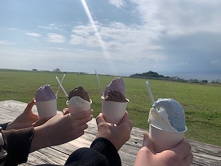 その後は展望台、シーザー農園を訪れ、ミルミル本舗へ。到着したころには朝からの曇りがちだった空もようやく太陽が姿を見せるようになり、少しずつ気温も上がってジェラートをいただくにはちょうどいいタイミングとなりました。